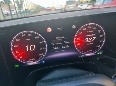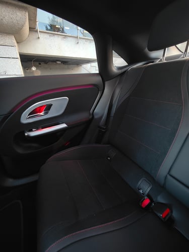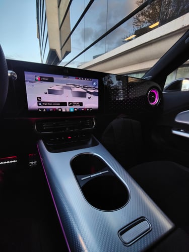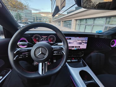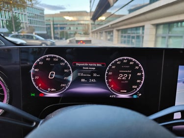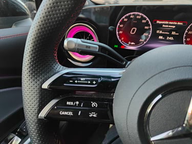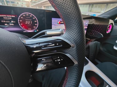 Pasamos al interior, y al igual que el exterior resulta cuanto menos llamativo. Presiden el salpicadero un cuadro de instrumentos digital, poco personalizable o al menos yo no he sabido, y una gran pantalla central que agrupa casi todas las funcionalidades del coche. Como opción podemos tener una tercera pantalla para el acompañante, que no montaba la unidad probada. La pantalla funciona con rapidez y su uso en general resulta bastante intuitivo, seguramente sea de los sistemas de infoentretenimiento más rápidos y cómodos. Este CLA estrena también la integración de un asistente con inteligencia artificial, pero no he podido ponerlo a prueba.