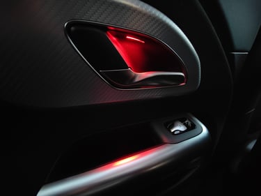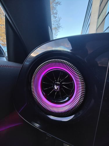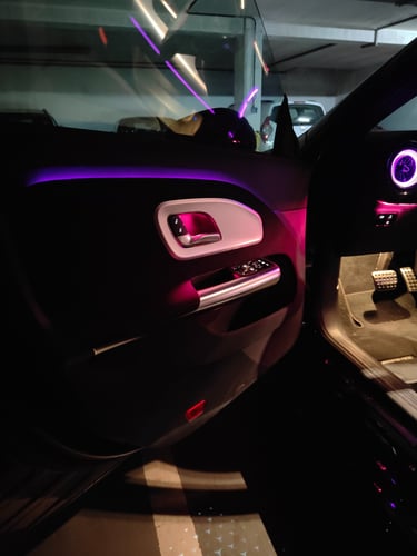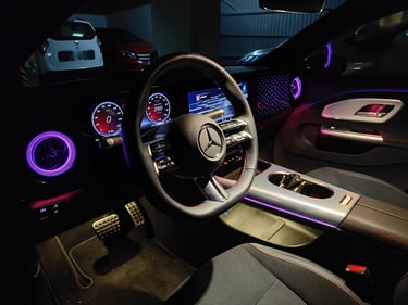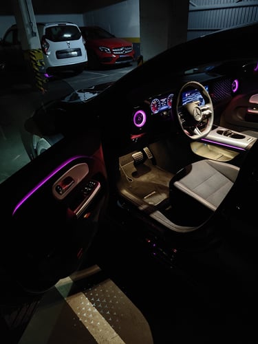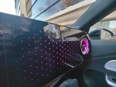 El juego de luces no es solo cosa del exterior en el CLA y como es costumbre en Mercedes cuidan la iluminación interior en este modelo. Esta presente tanto en el marco de las puertas como en la consola central y todo el salpicadero, especialmente en los aireadores y en la parte del copiloto, que al no disponer de la tercera pantalla que os comentaba, tenemos una serie de estrellas iluminadas.