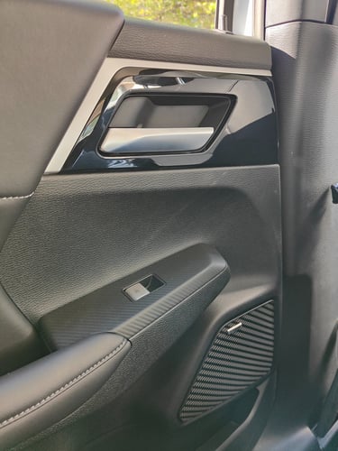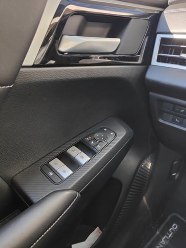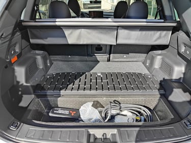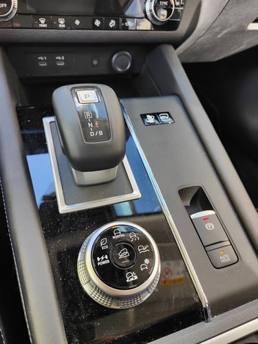 En la consola central encontramos una voluminosa palanca para la gestión del cambio, un botón de activación del modo one-pedal, otro similar para el modo EV, el cargador inalámbrico de móviles, dos puertos usb tipo C y una rueda para la gestión de modos de conducción (Presidida por un botón central para el control de descenso). Modos de conducción, que no son pocos, de izquierda a derecha: Power (modo Sport), ECO, Normal, Asfalto, Tierra, Nieve y Offroad. Identificables por los grafismos.